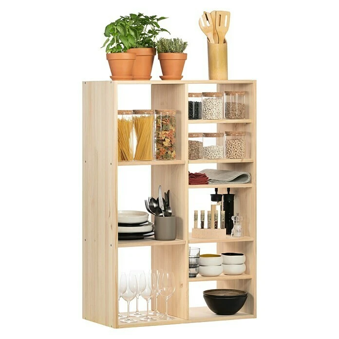 Das Holzregal von Astigarrara bietet großzügigen Stauraum auf geringer Grundfläche. Das Regal ist aus natürlichem Kiefernholz gefertigt und mit dem PEFC-Siegel versehen. Die Oberfläche ist unbehandelt, wodurch das Regal seine natürliche Farbe beibehält. Die sechs geräumigen Fächer sind quadratisch und erlauben die dekorative Aufbewahrung von Büchern, Pflanzen oder Dekoartikeln. Jeder der Regalböden erbringt eine Tragkraft von 50 kg. Da das Regal offen ist, kann es von beiden Seiten bestückt und auch als Raumtrenner verwendet werden.