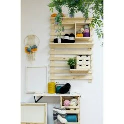 Das Wandpaneel von Astigarraga ermöglicht eine individuelle und variable Wandregalgestaltung. An den Querstreben des Paneels können verschiedene Regalböden, Kästen oder Garderobenpaneele werkzeuglos angebracht werden. Durch die Aufhängeschienen an diesen Artikeln können diese nicht herunterfallen und haben einen sicheren Halt. Das Paneel wird durch einfache Schraubmontage an der Wand montiert. Das Paneel ist aus natürlichem Kiefernholz gefertigt und mit dem PEFC-Siegel versehen.