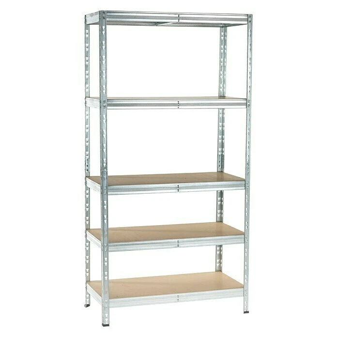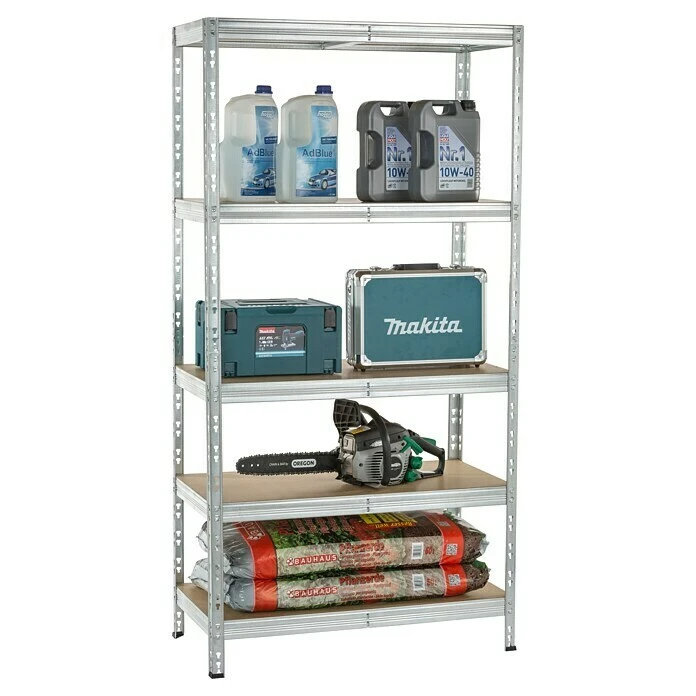 Das Metall-Schwerlastregal bietet Stauraum auf fünf Böden mit einer jeweiligen Traglast von 300 kg. Der Aufbau ist dank des Stecksystems einfach und problemlos. Durch die verzinkte Oberfläche ist das Regal vor Rost geschützt. Das Befestigen an einer Wandfläche ist optional möglich und sorgt für zusätzliche Stabilität.