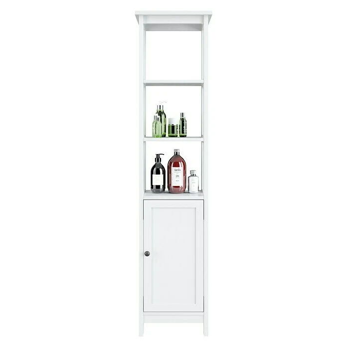 Das Hochregal Country von Phönix besticht durch das zeitlose und liebevolle Design im Landhaus-Stil. Das Regal eignet sich durch seine schmale Bauweise besonders für enge Nischen oder kleine Räume. Hinter der Tür verbergen sich zwei großzügige Fächer. Die oben aufgesetzten Fächer sind von allen Seiten offen, sodass der Zugang bequem möglich ist. Das Regal ist aus robustem und langlebigem MDF gefertigt.
