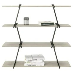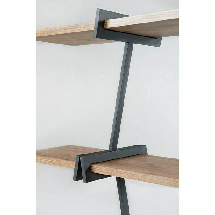 Das Regal Babylon von Phönix besteht aus vier Regalböden die Platz liefern für Bücher, Deko-Artikel und vielem mehr. Die Bretter sind mit asymmetrisch versetzten Metallstreben miteinander verbunden. Das Regal ist schlicht gehalten, hat aber durch die Maserung der Bretter und dem schwarz gefärbten Metall ein robustes Design. Es ist für alle Wohnbereiche, insbesondere für das Wohnzimmer geeignet.