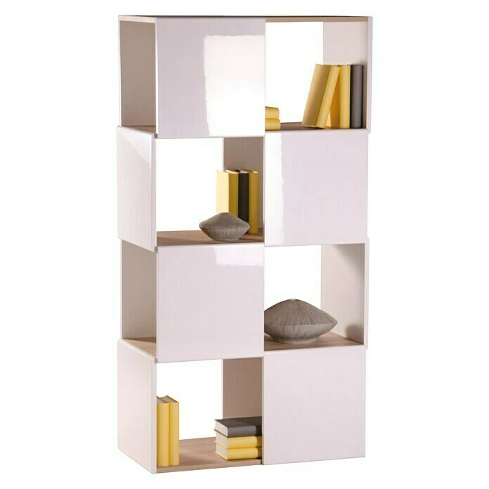Das Regal Matrix von Phönix eignet sich um Wohnbereiche effektiv voneinander abzutrennen oder zur Nutzung als Regal. Es bietet auf vier Böden Stauraum für Bücher oder Dekoartikel. Die Fächerböden bestehen aus melaminbeschichteten Spanplatten, welche in Eiche Sägerau gehalten sind und zusammen mit der lackierten Front in weiß einen harmonischen Kontrast setzen. Die versetzte Anordnung der Fächer runden das Design ab.