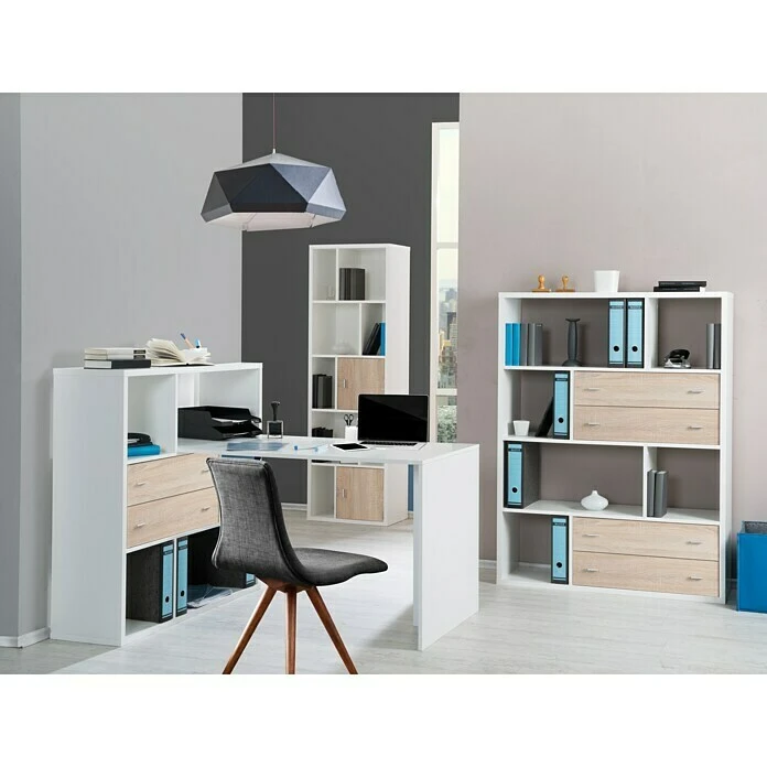 Der Schubladencontainer Toronto von Phönix dient als Regaleinsatz für die verschiedensten Toronto-Regale von Phönix und kann in diesen an beliebiger Stelle in den passenden Fächern angeordnet werden. Die Blende der zwei Schubladen ist in schicker Holzoptik gehalten, die durch die silberfarbenen Kunststoffgriffe noch zusätzlich optisch aufgewertet wird. Die leichtläufigen Schubladen bieten ausreichend Stauraum und schützen ihren Inhalt vor Staub, Sonnenlicht oder Verschmutzungen.