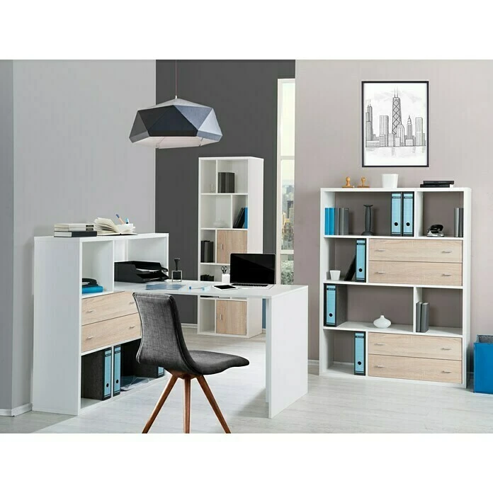 Das Regal Toronto von Phönix besteht aus acht Fächern in zwei unterschiedlichen Größen, die versetzt angeordnet sind. Dadurch entsteht eine abwechslungsreiche Optik, die es Ihnen erlaubt, Bücher, Akten und Deko-Elemente zu kombinieren und bewusst in Szene zu setzen. Weiterhin bieten verschiedene Einsatzmöglichkeiten wie Schubladen oder Schubkästen von Phönix oder Drittanbietern vielfältige Erweiterungsmöglichkeiten, damit sich Ihr Regal an Ihre individuellen Bedürfnisse anpasst. Durch die weiße Farbe des Regals fügt es sich subtil in jede Umgebung ein. Die Außenform erlaubt es, das Regal als niedriges Sideboard oder als hohes Wandregal zu nutzen.