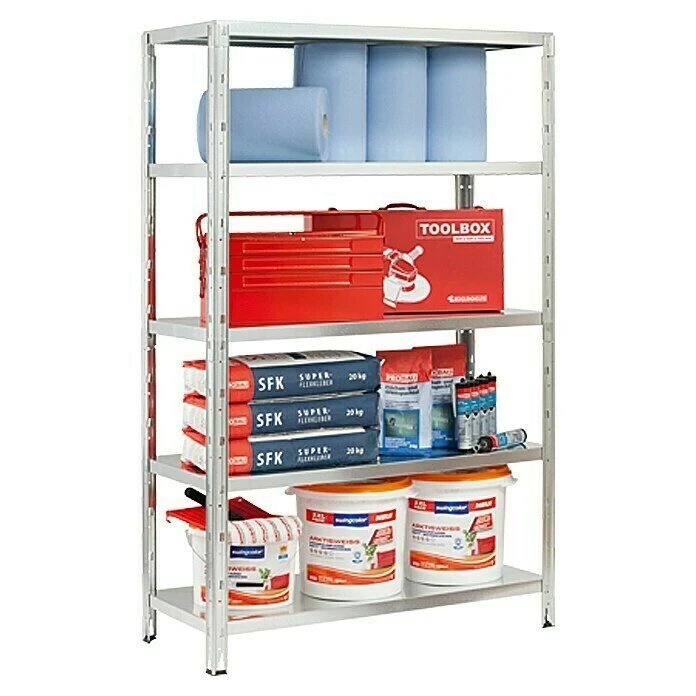 Das Regalux Steckregal bietet Stauraum auf fĂŒnf Böden mit einer jeweiligen Traglast von 200 kg. Der Aufbau ist dank des Stecksystems einfach und problemlos. Durch die verzinkte OberflĂ€che ist das Regal vor Rost geschĂŒtzt. Das Befestigen an einer WandflĂ€che ist optional möglich und sorgt fĂŒr zusĂ€tzliche StabilitĂ€t.