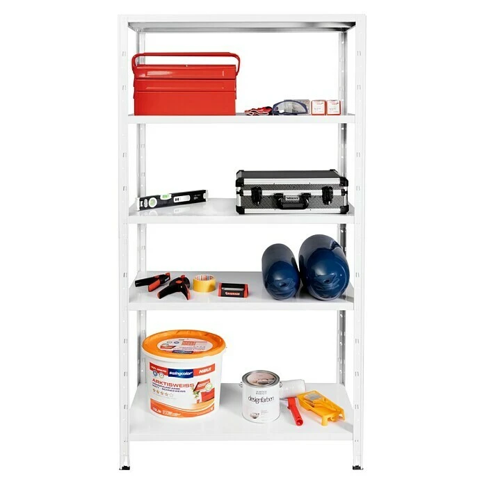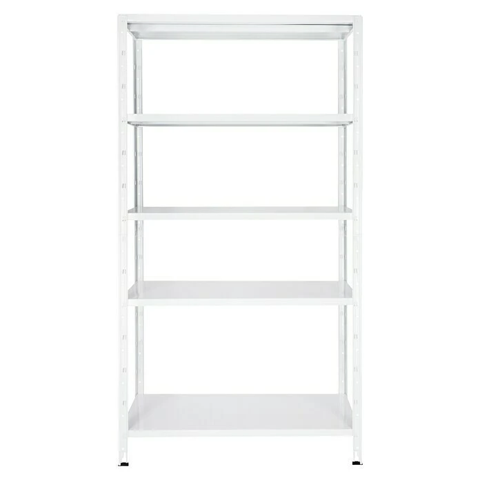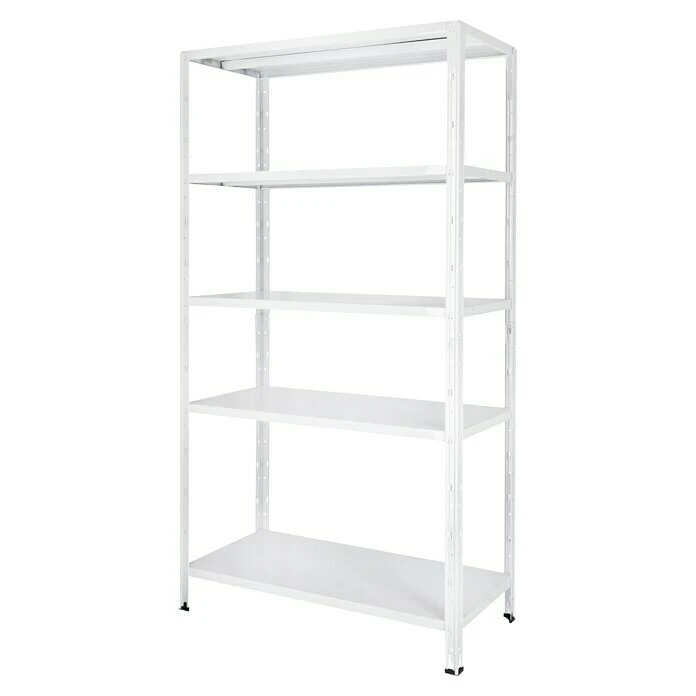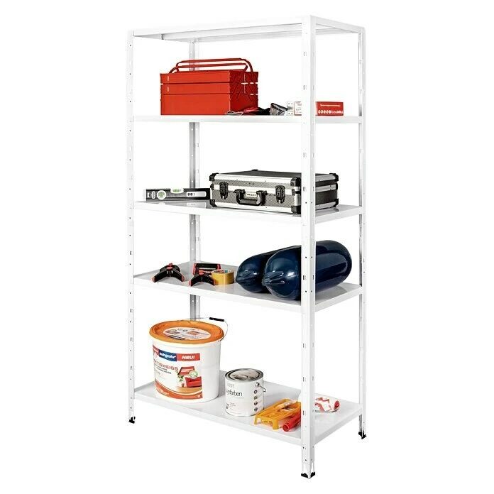 Das Regalux Steckregal bietet Stauraum auf fünf Böden mit einer jeweiligen Traglast von 65 kg. Der Aufbau ist dank des Stecksystems einfach und problemlos. Durch die weiß lackierte Oberfläche ist das Regal vor Rost geschützt. Das Befestigen an einer Wandfläche ist mit Hilfe des mitgelieferten Montagematerials optional möglich und sorgt für zusätzliche Stabilität.