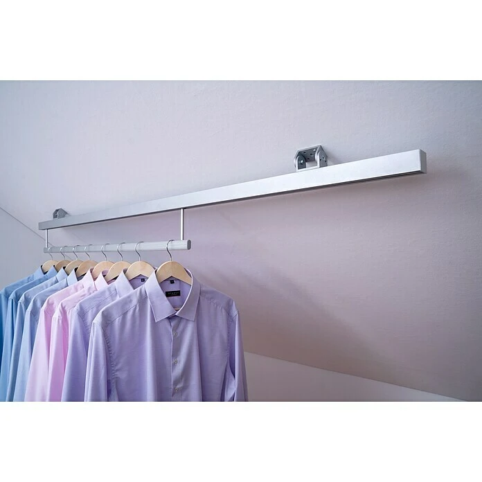 Mit dem Room Plaza Easy Doing Kleiderstangen-Set inklusive Halterungen lässt sich vorhandener Platz in Dachschrägen effektiv nutzen. Die fahrbare Kleiderstange kann einfach mit den im Lieferumfang enthaltenen Winkeln an der Schräge montiert werden. Sie ist die ideale Ergänzung in einem begehbaren Kleiderschrank und bietet genügend Raum für Blusen, Kleider, Jacken und Mäntel. Auf Maß gefertigte Room Plaza Raum- und Ausbausysteme sind exklusiv im BAUHAUS Fachcentrum bestellbar.
