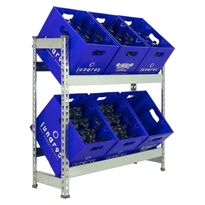 Das Getränkekistenregal Bottleclick von Simon Rack eignet sich ideal zur Einlagerung von bis zu Getränkekisten in Vorratsräumen, Werkstatt oder Garage. Das stabile Regal verfügt über mehrere Ebenen mit einer jeweiligen Traglast von 100 kg. Dank der schrägen Lagerung der Kisten ist die Flaschenentnahme jederzeit problemlos möglich. Die Montage gestaltet sich dank des Stecksystems sehr einfach.