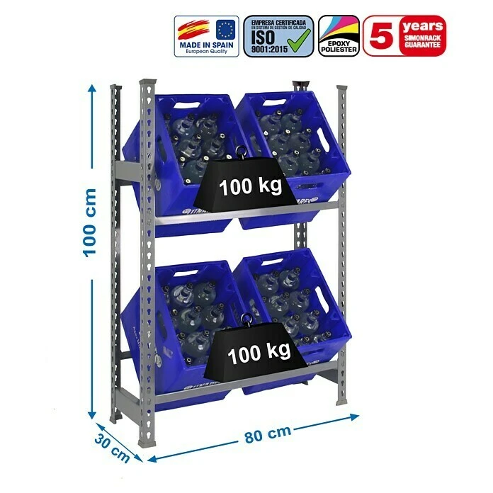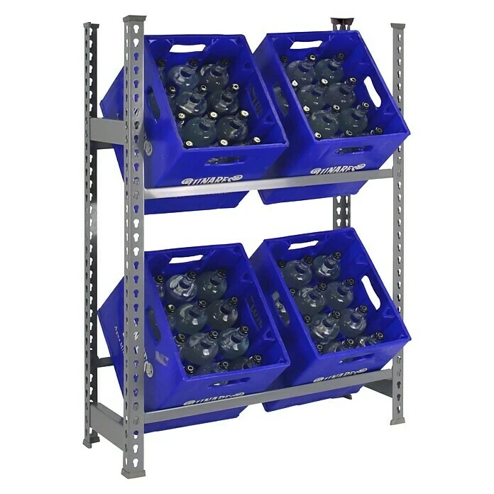 Das Getränkekistenregal Bottleclick von Simon Rack eignet sich ideal zur Einlagerung von Getränkekisten in Vorratsräumen, Werkstatt oder Garage. Das stabile Regal verfügt über 2 Ebenen mit einer jeweiligen Traglast von 100 kg und bietet Platz für maximal 1 Kiste pro Ebene. Dank der schrägen Lagerung der Kisten ist die Flaschenentnahme jederzeit problemlos möglich. Die Montage gestaltet sich dank des Stecksystems sehr einfach.