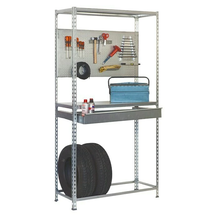 Das Reifen- und Lagerregal Mega Plus von Simon Rack ist ein Steckregal zur Einlagerung Ihrer Winter- und SommerrĂ€der in Werkstatt und Garage. DarĂŒber hinaus verfĂŒgt es ĂŒber einen Fachboden, eine Schublade und eine Lochblech RĂŒckwand zur Aufbewahrung von Werkzeugen. Der Aufbau ist dank des Stecksystems einfach und problemlos durchzufĂŒhren. Das Regal bietet auf einer ReifentrĂ€gerebenen, einem Regalboden und einer Schublade genĂŒgend Platz fĂŒr RĂ€der und andere GegenstĂ€nde. Die Tragkraft betrĂ€gt 200 kg pro Regalfach.