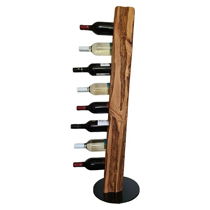 Dieser aus Massivholz in deutscher Handarbeit künstlich auf alt gestylte Weinständer, welcher sich nahtlos in jede Einrichtung einfügt, ist, aufgrund seiner ihm verliehenen Struktur, ein Unikat. Er eignet sich ideal als Geschenk für jeden Weinliebhaber oder für die perfekte Präsentation Ihres guten Weines. Die unterschiedlichen Narben, Risse und Einkerbungen verleihen dem Weinregal seine individuelle Note mit eigenem Charme und Charakter. Dieser Weinhalter weist eine Höhe von 113 cm und einen Durchmesser von 30 cm auf. Er bietet Platz für 8 Weinflaschen bei einem stabilen Stand auf einer runden, schwarz lackierten Stahlplatte. Die Flaschenhalterungen sind für Flaschen bis zu 80 mm Durchmesser (handelsübliche 0,75 l Flaschen) vorgesehen und bieten zudem mit ca. 8 cm Bohrtiefe einen stabilen Halt.