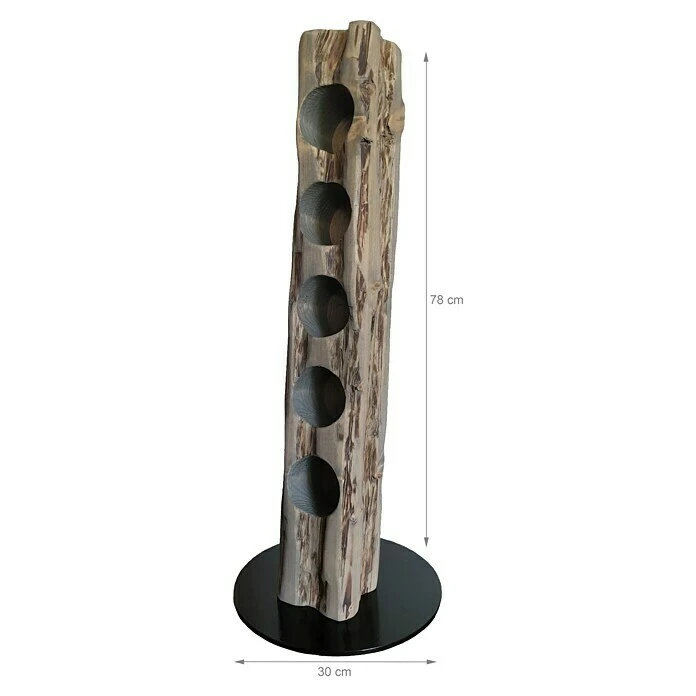 Dieser aus Massivholz in deutscher Handarbeit künstlich auf alt gestylte Weinständer, welcher sich nahtlos in jede Einrichtung einfügt, ist, aufgrund seiner ihm verliehenen Struktur, ein Unikat. Er eignet sich ideal als Geschenk für jeden Weinliebhaber oder für die perfekte Präsentation Ihres guten Weines. Die unterschiedlichen Narben, Risse und Einkerbungen verleihen dem Weinregal seine individuelle Note mit eigenem Charme und Charakter. Dieser Weinhalter weist eine Höhe von 78 cm und einen Durchmesser von 30 cm auf. Er bietet Platz für bis zu 5 Weinflaschen bei stabilem Stand auf einer runden, schwarz lackierten Stahlplatte; die Flaschenhalterungen sind für Flaschen bis zu 80 mm Durchmesser (handelsübliche 0,75 l Flaschen) vorgesehen und bieten zudem mit ca. 8 cm Bohrtiefe einen stabilen Halt.