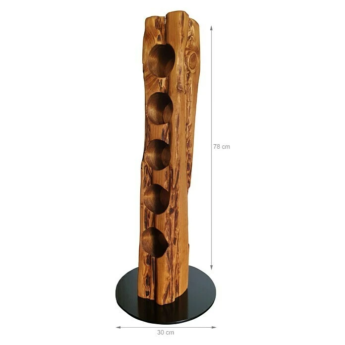 Dieser aus Massivholz in deutscher Handarbeit künstlich auf alt gestylte Weinständer, welcher sich nahtlos in jede Einrichtung einfügt, ist, aufgrund seiner ihm verliehenen Struktur, ein Unikat. Er eignet sich ideal als Geschenk für jeden Weinliebhaber oder für die perfekte Präsentation Ihres guten Weines. Die unterschiedlichen Narben, Risse und Einkerbungen verleihen dem Weinregal seine individuelle Note mit eigenem Charme und Charakter. Dieser Weinhalter weist eine Höhe von 78 cm und einen Durchmesser von 30 cm auf. Er bietet Platz für bis zu 5 Weinflaschen bei stabilem Stand auf einer runden, schwarz lackierten Stahlplatte; die Flaschenhalterungen sind für Flaschen bis zu 80 mm Durchmesser (handelsübliche 0,75 l Flaschen) vorgesehen und bieten zudem mit ca. 8 cm Bohrtiefe einen stabilen Halt.