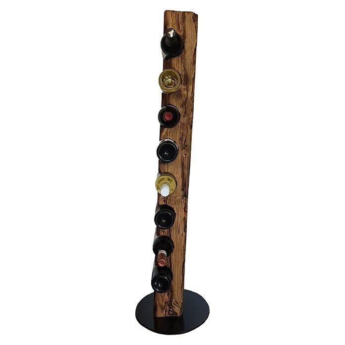 Dieser aus Massivholz in deutscher Handarbeit künstlich auf alt gestylte Weinständer, welcher sich nahtlos in jede Einrichtung einfügt, ist, aufgrund seiner ihm verliehenen Struktur, ein Unikat. Er eignet sich ideal als Geschenk für jeden Weinliebhaber oder für die perfekte Präsentation Ihres guten Weines. Die unterschiedlichen Narben, Risse und Einkerbungen verleihen dem Weinregal seine individuelle Note mit eigenem Charme und Charakter. Dieser Weinhalter weist eine Höhe von 113 cm und einen Durchmesser von 30 cm auf. Er bietet Platz für bis zu 8 Weinflaschen bei einem stabilen Stand auf einer runden, schwarz lackierten Stahlplatte. Die Flaschenhalterungen mit einem Ø von 80 mm sind speziell für handelsübliche 0,75 l Weinflaschen vorgesehen. Wir empfehlen Flaschen mit einem Ø von 68 – 80 mm zu verwenden.