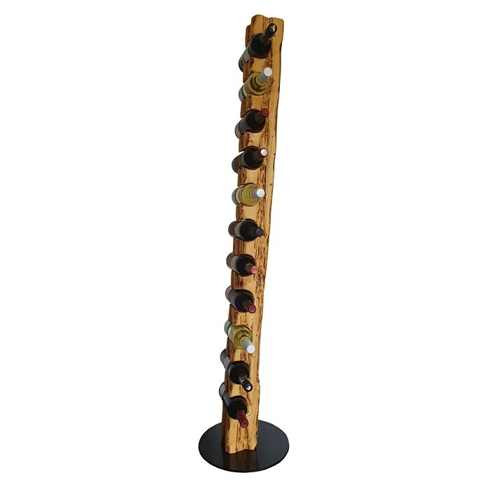 Dieser aus Massivholz in deutscher Handarbeit kĂŒnstlich auf alt gestylte WeinstĂ€nder, welcher sich nahtlos in jede Einrichtung einfĂŒgt, ist, aufgrund seiner ihm verliehenen Struktur, ein Unikat. Er eignet sich ideal als Geschenk fĂŒr jeden Weinliebhaber oder fĂŒr die perfekte PrĂ€sentation Ihres guten Weines. Die unterschiedlichen Narben, Risse und Einkerbungen verleihen dem Weinregal seine individuelle Note mit eigenem Charme und Charakter. Dieser Weinhalter weist eine Höhe von 158 cm und einen Durchmesser von 34 cm auf. Er bietet Platz fĂŒr bis zu 11 Weinflaschen bei einem stabilen Stand auf einer runden, schwarz lackierten Stahlplatte. Die Flaschenhalterungen mit einem Ă von 80 mm sind speziell fĂŒr handelsĂŒbliche 0,75 l Weinflaschen vorgesehen. Wir empfehlen Flaschen mit einem Ă von 68 â 80 mm zu verwenden.