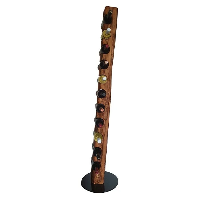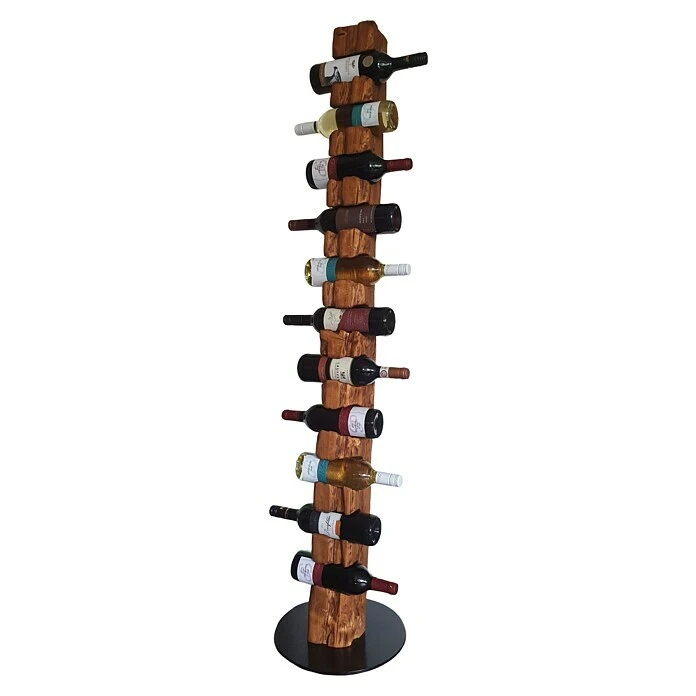 Dieser aus Massivholz in deutscher Handarbeit kĂŒnstlich auf alt gestylte WeinstĂ€nder, welcher sich nahtlos in jede Einrichtung einfĂŒgt, ist, aufgrund seiner ihm verliehenen Struktur, ein Unikat. Er eignet sich ideal als Geschenk fĂŒr jeden Weinliebhaber oder fĂŒr die perfekte PrĂ€sentation Ihres guten Weines. Die unterschiedlichen Narben, Risse und Einkerbungen verleihen dem Weinregal seine individuelle Note mit eigenem Charme und Charakter. Dieser Weinhalter weist eine Höhe von 158 cm und einen Durchmesser von 34 cm auf. Er bietet Platz fĂŒr bis zu 11 Weinflaschen bei einem stabilen Stand auf einer runden, schwarz lackierten Stahlplatte. Die Flaschenhalterungen mit einem Ă von 80 mm sind speziell fĂŒr handelsĂŒbliche 0,75 l Weinflaschen vorgesehen. Wir empfehlen Flaschen mit einem Ă von 68 â 80 mm zu verwenden.